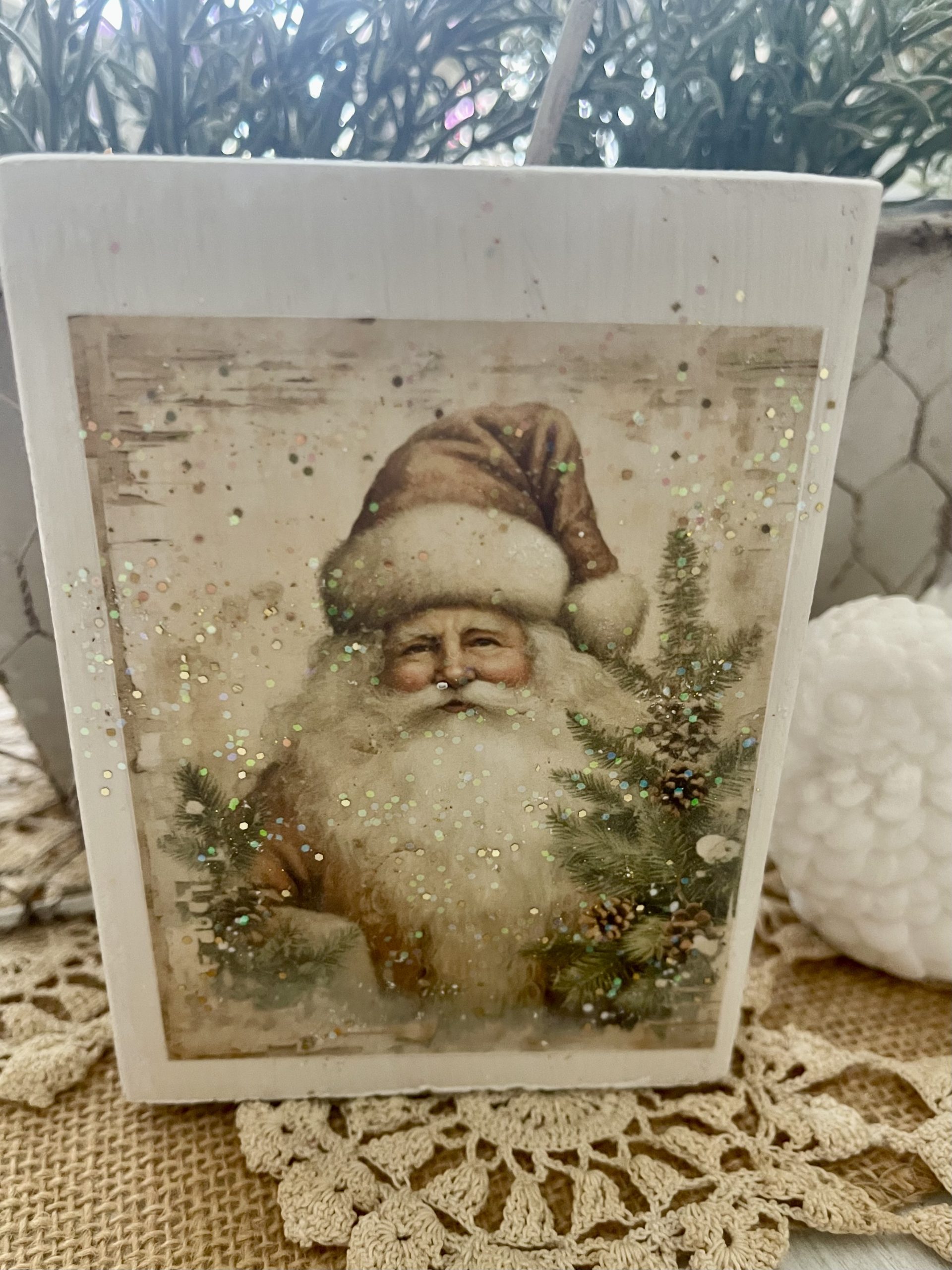 Double sided wood block with a ghost and Santa
